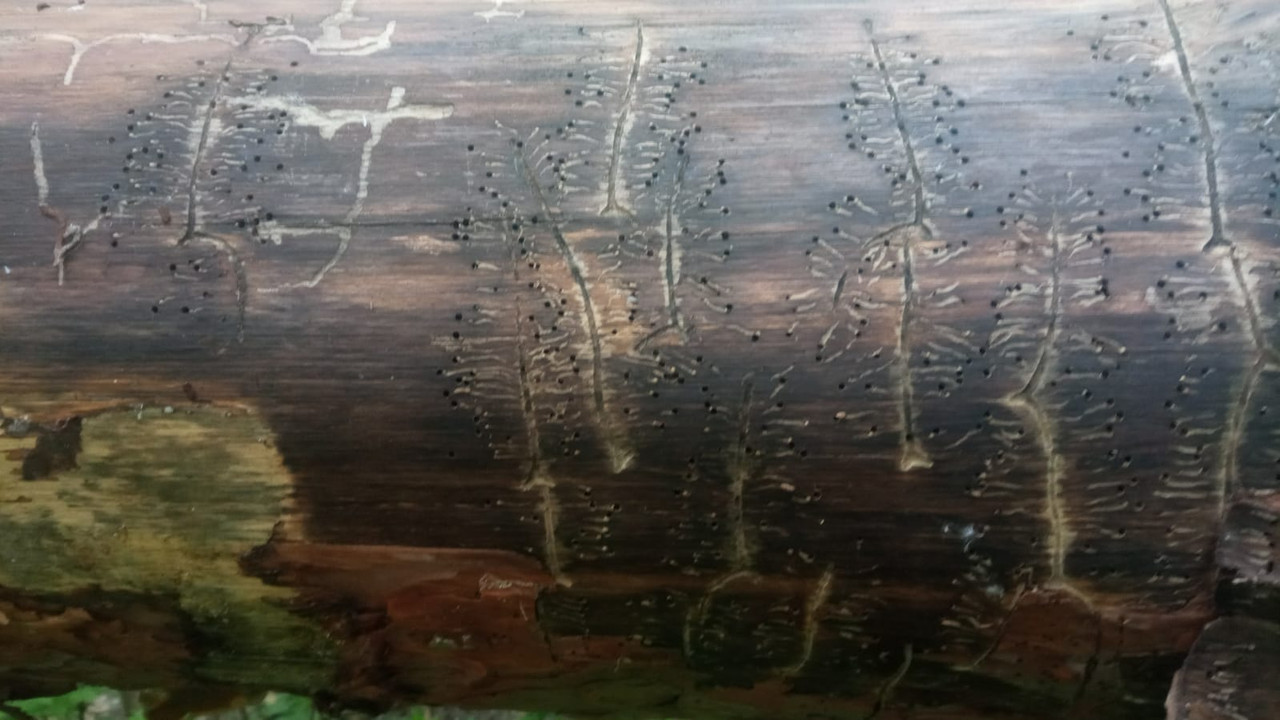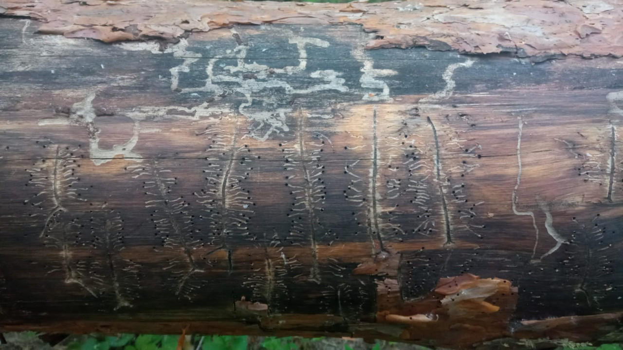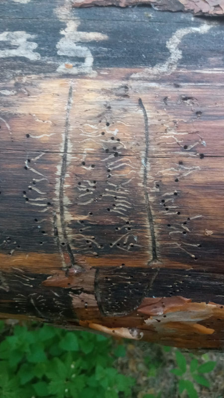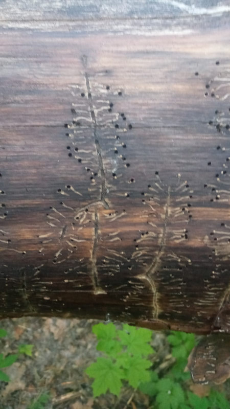 Это короеды сделали на той же упавшей сосне. Интересно получилось - съедая одни деревья, короеды делают другие "деревья". Даже как-то по-философски...